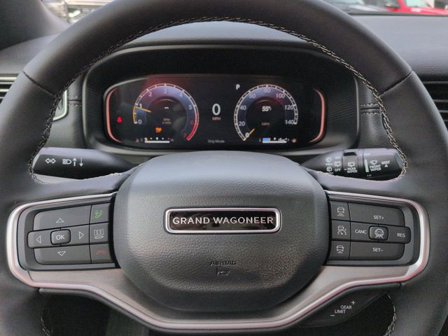 Quick Order Package 29E Grand Wagoneer, 118 Mph Maximum Speed Calibration, 3.55 Rear Axle Ratio, 3rd row seats: bench, 4-Wheel Disc Brakes, 9 Speakers, ABS brakes, Air Conditioning, Alloy wheels, AM/FM radio: SiriusXM with 360L, Anti-whiplash front head restraints, Apple CarPlay/Android Auto, Audio memory, Auto Adjust in Reverse Exterior Mirrors, Auto High-beam Headlights, Auto-dimming door mirrors, Auto-Dimming Exterior Driver Mirror, Auto-dimming Rear-View mirror, Auto-leveling suspension, Automatic temperature control, Brake assist, Bumpers: body-color, Compass, Delay-off headlights, Driver door bin, Driver vanity mirror, Driver's Seat Mounted Armrest, Dual front impact airbags, Dual front side impact airbags, Electronic Stability Control, Emergency communication system: Jeep Connect, Exterior Mirrors Approach Lamps, Exterior Mirrors with Memory, Exterior Mirrors with Supplemental Signals, Exterior Parking Camera Rear, Four wheel independent suspension, Front anti-roll bar, Front Bucket Seats, Front Center Armrest w/Storage, Front dual zone A/C, Front fog lights, Front reading lights, Fully automatic headlights, Garage door transmitter, Heated door mirrors, Heated Exterior Mirrors, Heated front seats, Heated steering wheel, Illuminated entry, Knee airbag, Leather Trimmed Bucket Seats, Low tire pressure warning, Memory seat, Navigation System, Normal Duty Suspension, Occupant sensing airbag, Outside temperature display, Overhead airbag, Overhead console, Panic alarm, Passenger door bin, Passenger seat mounted armrest, Passenger vanity mirror, Power door mirrors, Power driver seat, Power Liftgate, Power passenger seat, Power steering, Power windows, Radio data system, Radio: Uconnect 5 Nav with 12.0" Display, Rain sensing wipers, Rear air conditioning, Rear anti-roll bar, Rear reading lights, Rear seat center armrest, Rear window defroster, Rear window wiper, Reclining 3rd row seat, Remote keyless entry, Security system, Speed control, Speed-sensing steering, Speed-Sensitive Wipers, Split folding rear seat, Steering wheel memory, Steering wheel mounted audio controls, Tachometer, Telescoping steering wheel, Tilt steering wheel, Traction control, Trip computer, Turn signal indicator mirrors, Variably intermittent wipers, Ventilated front seats, Voltmeter, and Wheels: 20" x 9" Machine Face Painted Aluminum.