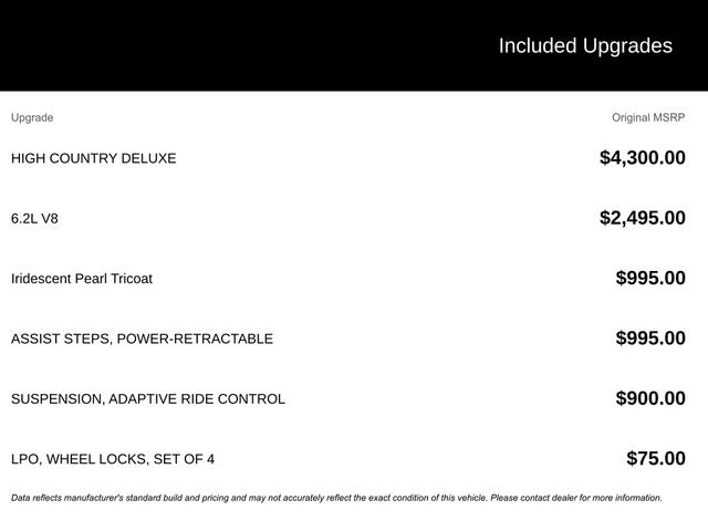 This 2021 Chevrolet Silverado 1500 High Country in Iridescent Pearl Tricoat features: 4D Crew Cab, EcoTec3 6.2L V8, 10-Speed Automatic, 4WD, 10-Way Power Driver Seat w/Lumbar, 10-Way Power Passenger Seat Adjuster w/Lumbar, 12-Volt Rear Auxiliary Power Outlet, 120-Volt Bed Mounted Power Outlet, 120-Volt Instrument Panel Power Outlet, 4-Wheel Disc Brakes, 4G LTE Wi-Fi Hot Spot Capable, 4G WiFi Hotspot Telematics, 8" Driver Information Center, ABS brakes, Adaptive Cruise Control, Adaptive Cruise Control, Adaptive Ride Control Suspension, Adaptive Ride Package, Adaptive Suspension, Advanced Trailering System, All-Weather Floor Liner (LPO), AM/FM radio: SiriusXM with 360L, Android Auto, Apple Carplay, Apple CarPlay/Android Auto, Auto LED Headlights, Auto-dimming door mirrors, Auto-Dimming Inside Rear-View Mirror, Auto-Locking Rear Differential, Automatic Emergency Braking, Automatic temperature control, Auxiliary External Transmission Oil Cooler, Backup Camera, Bluetooth w/ Audio Streaming, Bluetooth® For Phone, Bose High End Sound Package, Brake assist, Chevrolet Connected Access Capable, Chevytec Spray-On Black Bedliner, Chrome Assist Steps, Chrome Grille, Chrome Recovery Hooks, Cold Weather Package, Color-Keyed Carpeting Floor Covering, Compass, Deep-Tinted Glass, Delay-off headlights, Driver Memory, Dual Exhaust w/Polished Outlets, Electric Rear-Window Defogger, Electrical Lock Control Steering Column, Electronic Cruise Control, Electronic Stability Control, Floor Mounted Center Console, Following Distance Indicator, Following Distance Indicator, Forward Collision Alert, Foward Collison Alert, Front & Rear Park Assist, Front Carpeted Floor Mats, Front Center Armrest, Front dual zone A/C, Front fog lights, Front LED Fog Lamps, Front Pedestrian Braking, Front Pedestrian Braking, Front wheel independent suspension, Fully automatic headlights, Garage door transmitter, HD Rear Vision Camera, Heated door mirrors, Heated Driver & Front Outboard Passenger Seats, Heated Steering Wheel, Heated steering wheel, Heavy Duty Suspension, High Country Deluxe, Hitch Guidance, Hitch Guidance w/ Hitch View, Hitch Guidance w/Hitch View, Illuminated entry, Integrated Trailer Brake Controller, IntelliBeam Automatic High Beam On/Off, Keyless Open & Start, Lane Change Alert, Lane Change Alert w/Side Blind Zone Alert, Lane Departure Warning, Lane Keep Assist w/Lane Departure Warning, Lane Keeping System, Leather Seats, Leather Wrapped Steering Wheel, LED Cargo Area Lighting, LED Foglights, Low tire pressure warning, Manual Tilt/Telescoping Steering Column, Memory seat, Navigation System, OnStar & Chevrolet Connected Services Capable, Outside Heated Power-Adjustable Mirrors, Outside temperature display, Overhead console, Painted Mirror Caps, Panic alarm, Parking Sensors, Perforated Leather Seat Trim, Power Door Locks, Power door mirrors, Power Front Passenger Windows w/Express Up/Down, Power Front Windows w/Driver Express Up/Down, Power Mirror Package, Power Package, Power passenger seat, Power Rear Windows w/Express Down, Power Running Boards, Power Sliding Rear Window w/Rear Defogger, Power Sunroof, Power Tailgate, Power-Retractable Assist Steps, Preferred Equipment Group 3LZ, Preferred Equipment Package, Premium audio system: Chevrolet Infotainment 3 Premium, Premium Sound Package, Push Button Start, Radio data system, Radio: Chevrolet Infotainment 3 Premium System, Rear Carpeted Floor Mats, Rear Cross Traffic Alert, Rear Cross Traffic Alert, Rear Dual USB Charging-Only Ports, Rear seat center armrest, Rear step bumper, Rear Wheelhouse Liners, Remote keyless entry, Remote Start, Remote Vehicle Starter System, Reverse Brake Assist, Reverse Sensing, Safety Alert Seat, Safety Package, Safety Package II, Security system, SiriusXM w/360L, Speed-sensing steering, Standard Tailgate, Steering Wheel Audio Controls, Steering wheel