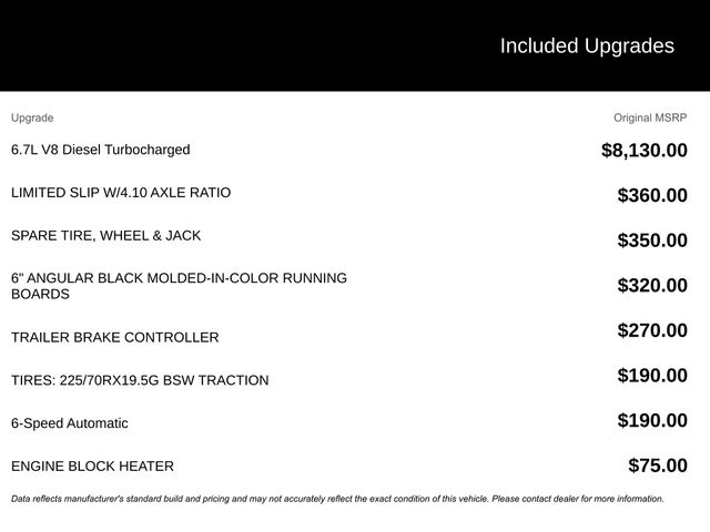 ⢠6.7L V8 Diesel Turbocharged (Power Stroke) (B20) (4.10 Axle Ratio) (Dual 78 AH 750 CCA Batteries) (Includes Intelligent Oil-Life Monitor, Turbo Gauges, 200 Amp Extra Heavy Duty Alternator)