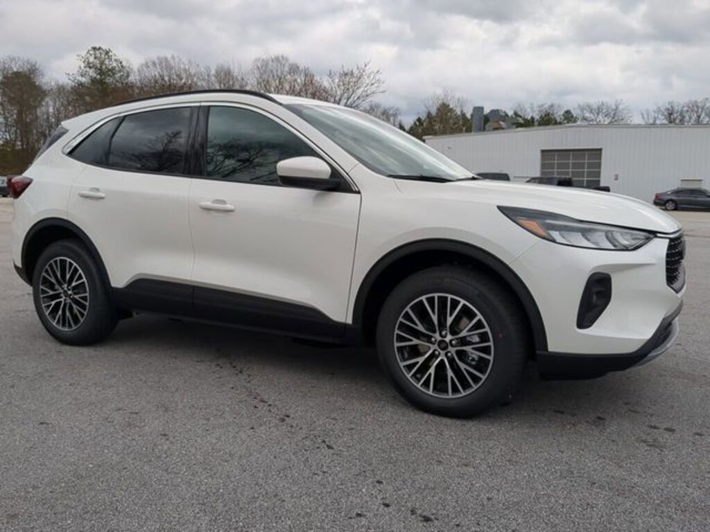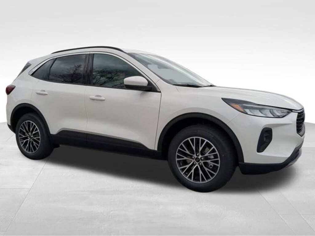 This 2024 Ford Escape Plug-In Hybrid in Star White Metallic Tri-Coat features: **LOCAL TRADE**, **SERVICED HERE SINCE NEW**, 13.2" LCD Centerstack Touchscreen, Backup Camera, Blind Spot Monitoring, BLIS w/ Cross Traffic Alert, Bluetooth w/ Audio Streaming, Cold Weather Package, Lane Keeping System, Parking Sensors, Power Mirror Package, Power Package, Remote Start, Reverse Brake Assist, Reverse Sensing, NAVIGATION!, 4D Sport Utility, 2.5L iVCT, eCVT, FWD, 4-Wheel Disc Brakes, ABS brakes, Alloy wheels, AM/FM radio: SiriusXM, Auto High-beam Headlights, Automatic temperature control, Brake assist, Delay-off headlights, Electronic Stability Control, Emergency communication system: SYNC 4 911 Assist, Equipment Group 700A, Exterior Parking Camera Rear, FordPass Connect, Four wheel independent suspension, Front Center Armrest, Front dual zone A/C, Front fog lights, Fully automatic headlights, Heated door mirrors, Heated front seats, Heated steering wheel, Heated Vinyl/Cloth Front Sport Contour Bucket Seats, Illuminated entry, Low tire pressure warning, Navigation system: Connected Navigation, Outside temperature display, Overhead console, Panic alarm, Power door mirrors, Power driver seat, Power Liftgate, Power steering, Power windows, Rear seat center armrest, Rear window wiper, Remote keyless entry, Roof rack: rails only, Speed control, Speed-sensing steering, Speed-Sensitive Wipers, Split folding rear seat, Spoiler, Steering wheel mounted audio controls, SYNC 4 w/Enhanced Voice Recognition, Telescoping steering wheel, Tilt steering wheel, Traction control.