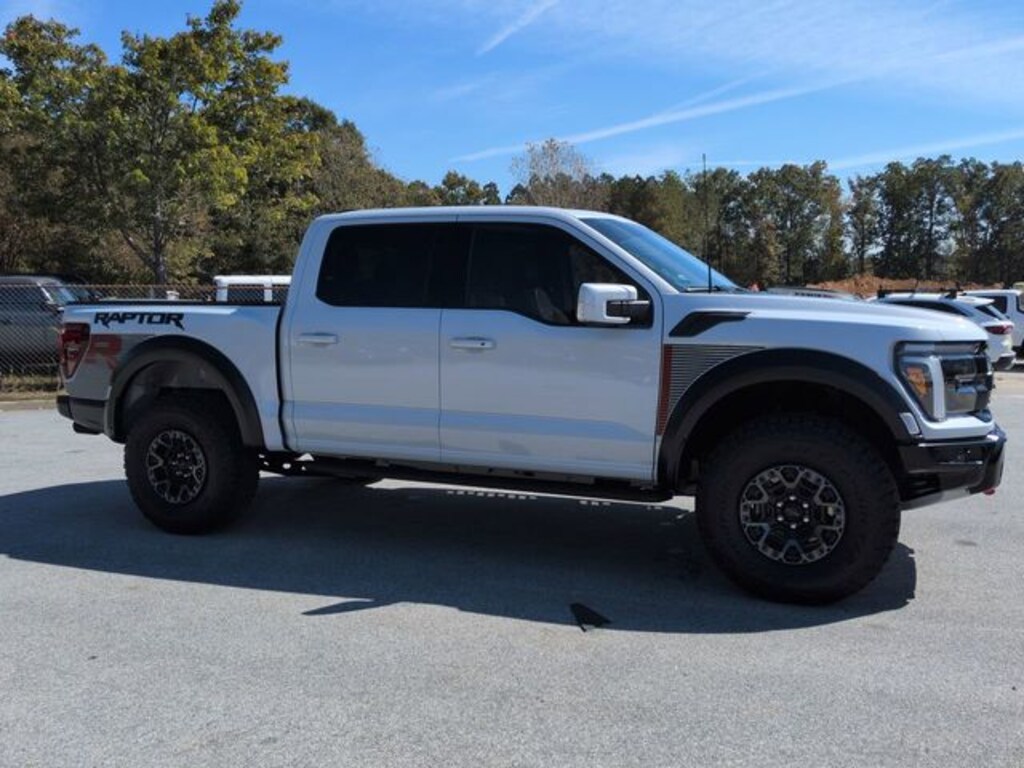 This 2025 Ford F-150 Raptor in Space White Metallic features: 4D SuperCrew, 5.2L V8, 10-Speed Automatic, 4WD, **700hp**, 12" LCD Productivity Touchscreen, 14 Speakers, 360-Degree Camera, 4-Wheel Disc Brakes, 5G WiFi Hotspot Telematics, ABS brakes, Active Exhaust, Adaptive Cruise Control, Adjustable pedals, AM/FM radio: SiriusXM with 360L, Android Auto, Apple Carplay, Auto Emergency Braking, Auto High-beam Headlights, Auto LED Headlights, Auto-dimming door mirrors, Auto-dimming Rear-View mirror, Automatic temperature control, Backup Camera, Blind Spot Monitoring, BLIS w/ Cross Traffic Alert, Bluetooth w/ Audio Streaming, Brake assist, Bumpers: body-color, Code Orange Front Tow Hooks, Code Orange Stitching Doors & Instrument Panel, Cold Weather Package, Compass, Delay-off headlights, Dual Valve Shocks, Electronic Locking w/4.10 Axle Ratio, Electronic Stability Control, Emergency communication system: SYNC 4 911 Assist, Equipment Group 803A Raptor R, Fox Suspension, Front Center Armrest, Front dual zone A/C, Front fog lights, Front wheel independent suspension, Fully automatic headlights, Garage door transmitter, HD Surround Vision, Heads-Up Display, Heated door mirrors, Heated front seats, Heated rear seats, Heated steering wheel, Hill Descent Control, Illuminated entry, Interior Code Orange Raptor R Badging, Lane Departure Warning System, Lane Keeping System, Leather Seats, Leather Trimmed Seats, LED Foglights, LED Projector Headlights, Low tire pressure warning, Memory Package, Memory seat, Modular Front Bumper, Multimedia Package, Navigation system: Connected Navigation, Off Road Package, Panic alarm, Panoramic Sunroof/Moonroof, Pedal memory, Performance Handling Package, Performance Package, Post Collision Braking, Power door mirrors, Power Mirror Package, Power Package, Power passenger seat, Power Sliding Rear Window, Pre Collision Assist w/ AEB, Premium Audio Package, Premium Sound Package, Pro Trailer Backup Assist, Pro Trailer Hitch Assist, Push Button Start, Radio data system, Radio: B&O Unleashed Sound System by Bang & Olufsen, Rain sensing wipers, Raptor R Badge Tailgate Applique, Raptor R Exterior Graphics, Raptor R Exterior Theme, Raptor R Interior Theme, Raptor R Unique Grille, Raptor R Unique Hood Vent w/R Badge, RECARO w/Code Orange Stitching Front Seats, Remote keyless entry, Remote Start, Removes 2KW Pro Power Onboard, Reverse Brake Assist, Reverse Sensing, Security system, Skid Plate Package, Speed control, Speed-sensing steering, Split folding rear seat, Steering wheel memory, Steering wheel mounted audio controls, SYNC 4 w/Enhanced Voice Recognition, Telescoping steering wheel, Tilt steering wheel, Tow Package, Traction control, Trailer Package, Trip computer, Turn signal indicator mirrors, Unique Carbon Fiber Appliques, Upgraded Dual Exhaust, Ventilated front seats, Wheels: Raptor R Unique 17" Forged Aluminum, Wireless Charging Pad.