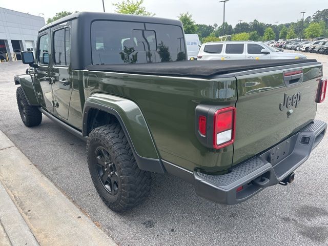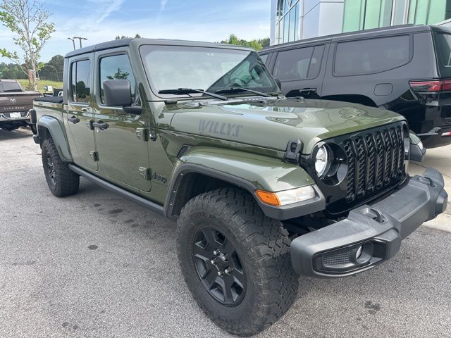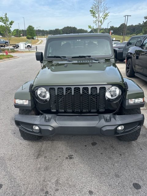 This 2021 Jeep Gladiator Willys in Sarge Green Clearcoat features: **LOCAL TRADE**, 4-Wheel Disc Brakes, 7 & 4 Pin Wiring HArness, 8 Speakers, ABS brakes, Air Conditioning, Aluminum Wheels, AM/FM radio, Anti-Spin Differential Rear Axle, Automatic Headlamps, Backup Camera, Black 3 Piece Hard Top, Black 3-Piece Hard Top, Black Grille, Black Grille, Bluetooth w/ Audio Streaming, Brake assist, Class IV Hitch Receiver, Class IV Receiver Hitch, Cloth Low-Back Bucket Seats, Command Trac PartTime 4WD, Convenience Package, Daytime Running Lamp System, Electronic Stability Control, Freedom Panel Storage Bag, Front 1-Touch Down Power Windows, Front Bucket Seats, Front fog lights, Front/Rear DANA 44 Axles, Integrated Voice Command, ParkView Rear Back-Up Camera, Power Heated Mirrors, Power Mirror Package, Power Package, Power steering, Power Tailgate Lock, Preferred Package 24W, Push Button Start, Radio: Uconnect 3 w/5" Display, Rear Sliding Window, Rear Window Defroster, Remote Keyless Entry, Skid Plate Package, Speed control, Speed Sensitive Power Locks, Tow Package, Traction control, Trailer Hitch Zoom, Uconnect 3 w/ 5.0" Touchscreen, Wheels: 17" x 7.5" Black Aluminum w/Gray Pad, Willys, Willys Hood Decal.