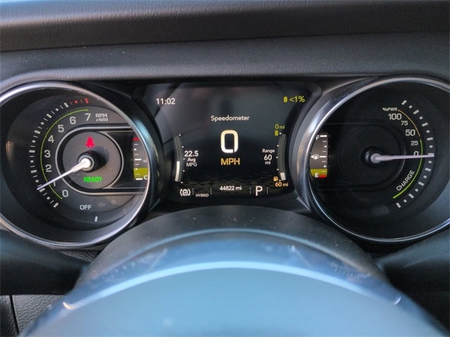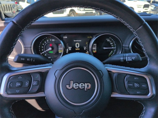 This 2022 Jeep Wrangler Unlimited Sahara 4xe in Black Clearcoat features: 4D Sport Utility, 2.0L I4 DOHC, 8-Speed Automatic, 4WD, 4-Wheel Disc Brakes, 9 Speakers, ABS brakes, Alloy wheels, AM/FM radio, Android Auto, Apple Carplay, Apple CarPlay/Android Auto, Auto LED Headlights, Auto-dimming Rear-View mirror, Automatic temperature control, Backup Camera, Bluetooth w/ Audio Streaming, Brake assist, Compass, Delay-off headlights, Electronic Stability Control, Emergency communication system: SiriusXM Guardian, Front Bucket Seats, Front Center Armrest w/Storage, Front dual zone A/C, Front fog lights, Fully automatic headlights, Garage door transmitter, Heated door mirrors, Hill Start Assist, Illuminated entry, Integrated roll-over protection, Leather Shift Knob, Leather steering wheel, Low tire pressure warning, Navigation System, Outside temperature display, Panic alarm, ParkView Rear Back-Up Camera, Passenger door bin, Power door mirrors, Power steering, Power windows, Preferred Equipment Package, Premium McKinley Trimmed Seats, Quick Order Package 29P, Radio data system, Radio: Uconnect 4C Nav w/8.4" Display, Rear seat center armrest, Remote keyless entry, Security system, Speed control, Split folding rear seat, Sport Suspension, Steering wheel mounted audio controls, Telescoping steering wheel, Tilt steering wheel, Traction control, Trip computer, Variably intermittent wipers, Wheels: 20" x 8" Fully Painted Aluminum.