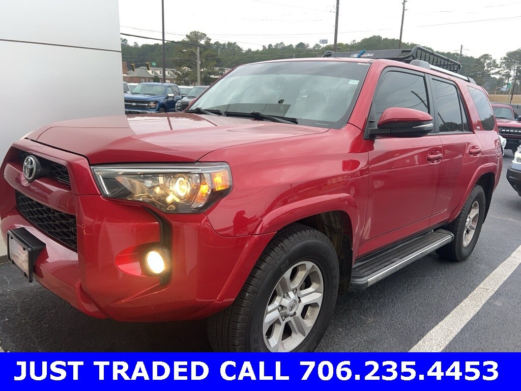 Barcelona Red Metallic 2019 Toyota 4Runner SR5 Premium RWD SR5 Premium **LOCAL TRADE**, Skid Plate Package, Sunroof/Moonroof, 4D Sport Utility, 4.0L V6 SMPI DOHC, 5-Speed Automatic with Overdrive, RWD, Sand Beige w/Softex Synthetic Leather Seat Trim, 17" x 7.0" 6-Spoke Alloy Wheels, 4-Wheel Disc Brakes, 8 Speakers, ABS brakes, Alloy wheels, AM/FM radio: SiriusXM, Auto-Dimming Rear-View Mirror, Auto-dimming Rear-View mirror, Body Color Heated Mirrors, Brake assist, Compass, Electronic Stability Control, Emergency communication system: Safety Connect, Exterior Parking Camera Rear, Front Center Armrest, Front fog lights, Front wheel independent suspension, Garage Door Opener, Garage door transmitter: HomeLink, Heated door mirrors, Heated Front Bucket Seats, Heated front seats, Illuminated entry, Leather Shift Knob, Leather steering wheel, Low tire pressure warning, Outside temperature display, Overhead console, Panic alarm, Power door mirrors, Power driver seat, Power passenger seat, Power steering, Power windows, Radio: Entune Premium Audio w/Navigation, Rear seat center armrest, Rear window wiper, Remote keyless entry, Security system, Softex Synthetic Leather Seat Trim, Speed control, Speed-sensing steering, Split folding rear seat, Spoiler, SR5 Premium Package w/Softex, Steering wheel mounted audio controls, Telescoping steering wheel, Tilt steering wheel, Traction control, Trip computer, Turn signal indicator mirrors, Variably intermittent wipers.